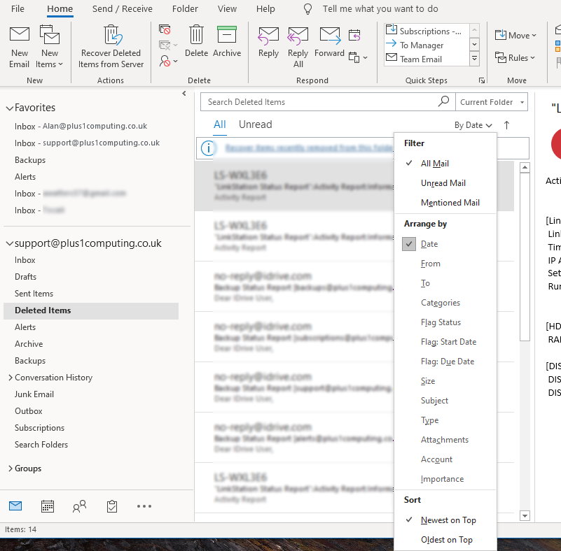 The other large folder will be your Sent Items folder, and it’s easy to forget this. You can browse through this in exactly the same way as the Inbox – viewing items by Date or by Size and deleting as required.